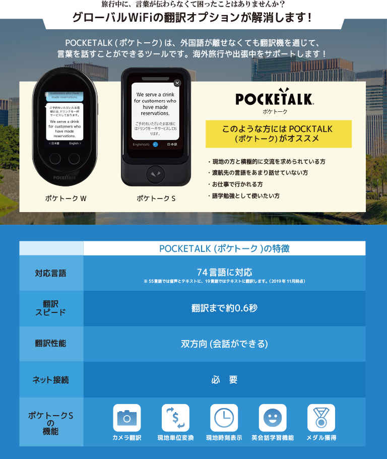 グローバルWiFiなら、館内・スポット以外のところはもちろん、移動中でもネット接続ができるので、地図アプリやガイドブックアプリ、翻訳アプリなど、使いたいときに自由に使う事ができます。