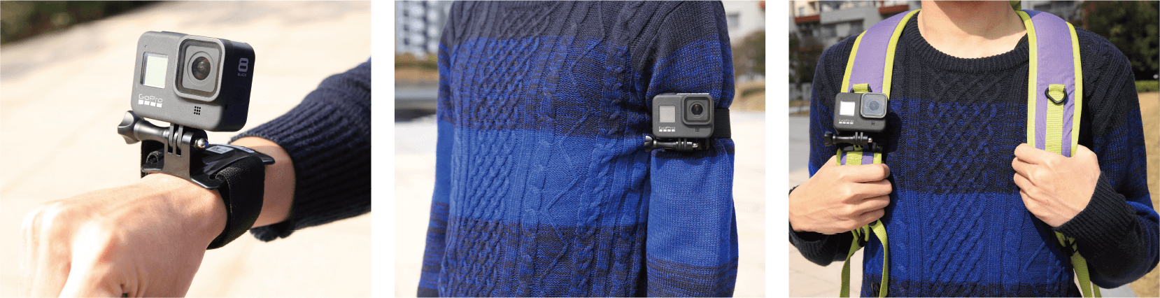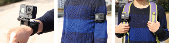 アームマウントを手首やバッグのベルトに固定して撮影することができます。