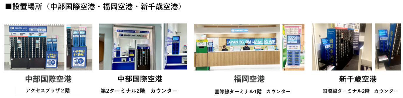 従来のスマートロッカー「スマートピックアップ」と比べてコンパクトで省スペースに設置できる「グローバルWiFi®レンタルステーション」は、今後も設置場所を順次拡大していく予定です。現在は新千歳空港・羽田空港・中部国際空港・伊丹空港・関西国際空港・福岡空港の6空港に設置しています。 今後は、ホテルや観光案内所など、利用者のみなさまにご利用いただきやすい場所への設置も進めてまいります。 「グローバルWiFi®レンタルステーション」の設置に関するお問い合わせは、下記までご連絡ください。 グローバルWiFi®レンタルステーション係:[email protected]