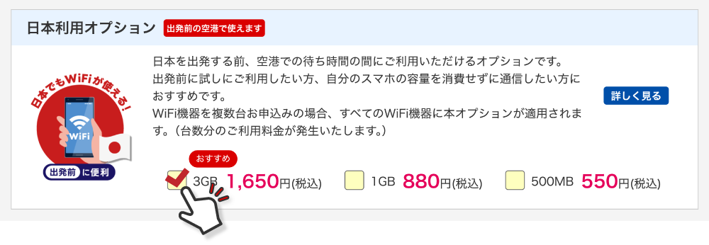 お申込みフォーム内の「日本利用オプション」から、ご希望のデータ容量をご選択ください。