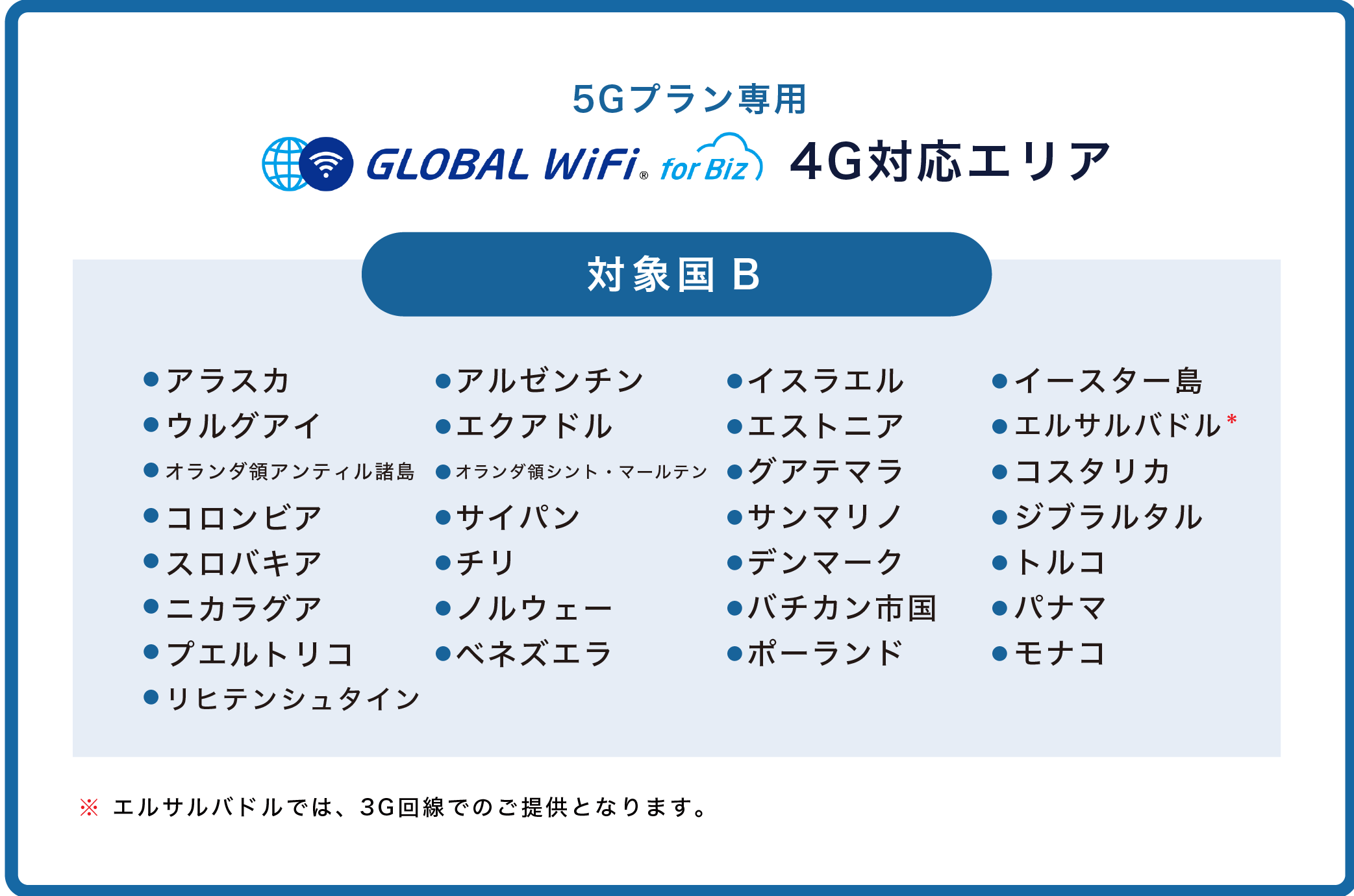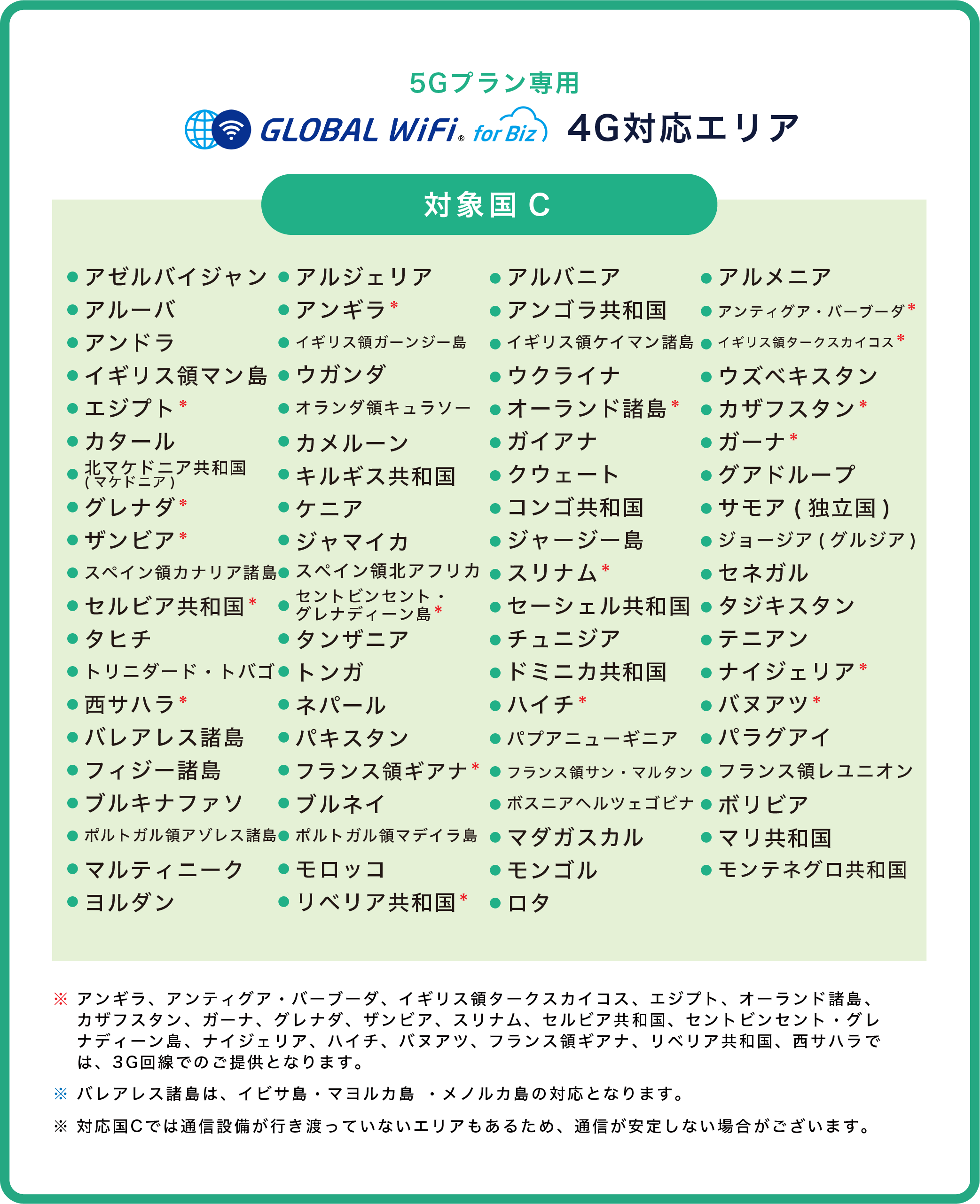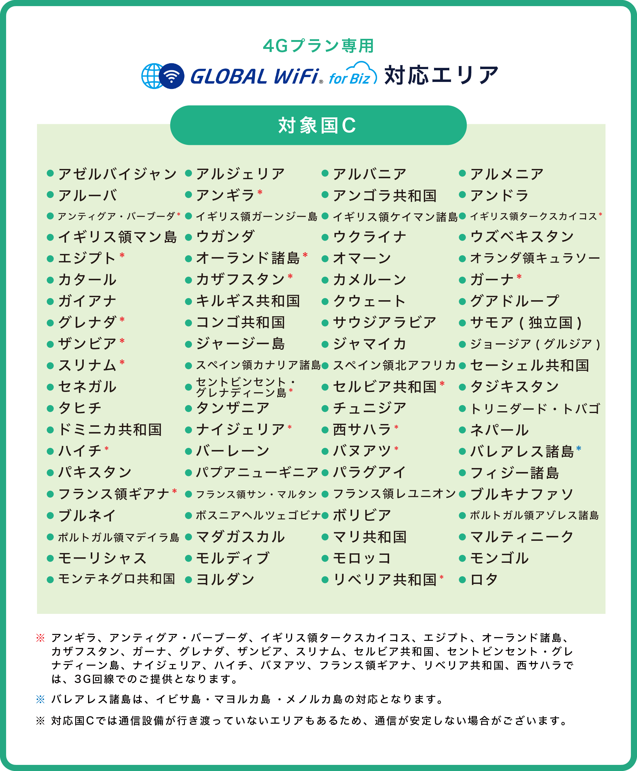 ※対象国B,Cの一部エリアでは3G回線のみのご提供となります。詳細は「一覧を見る」をご参照ください。