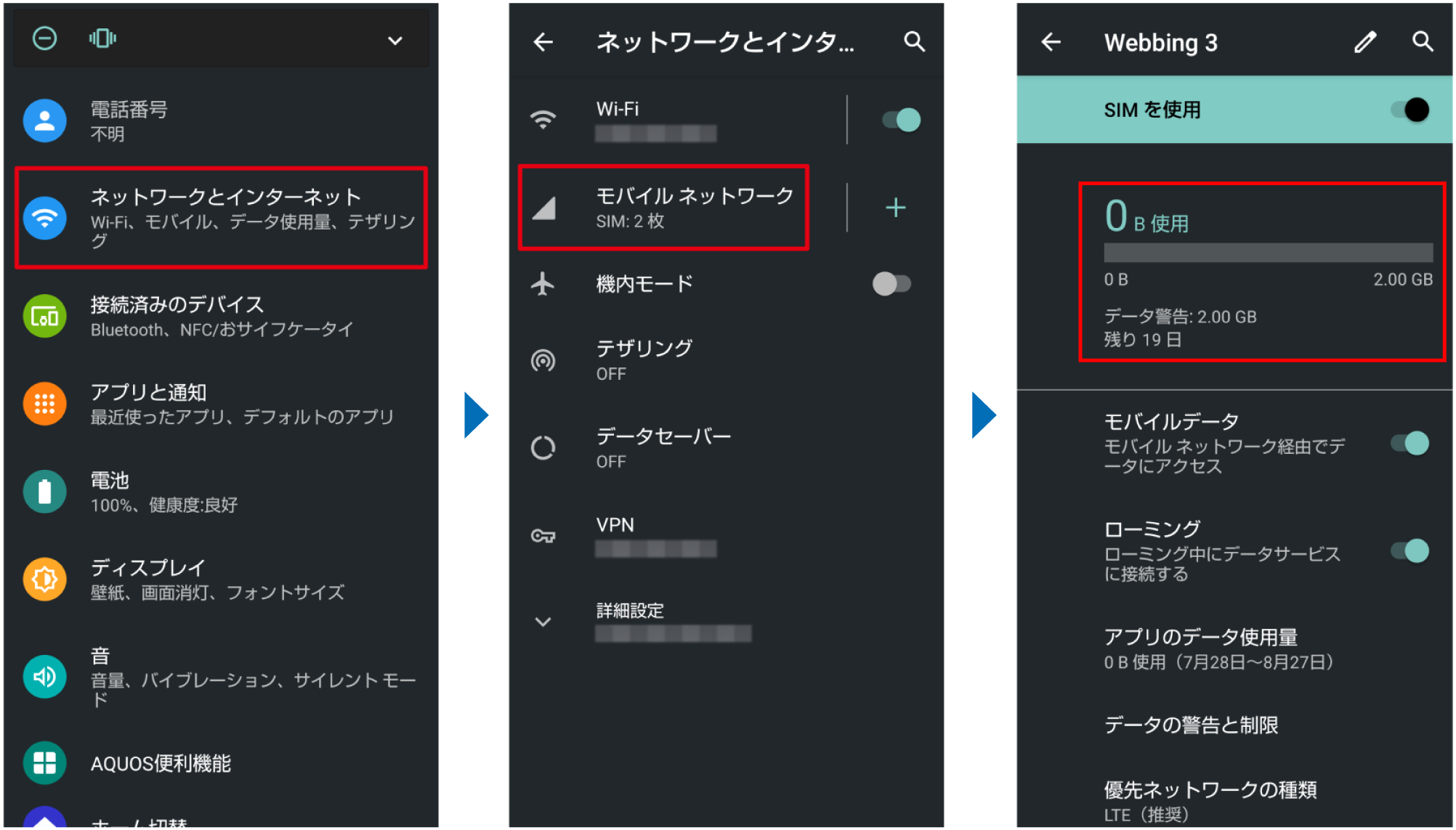 利用したデータ通信量をスマートフォンで確認する方法は下記をご確認ください。