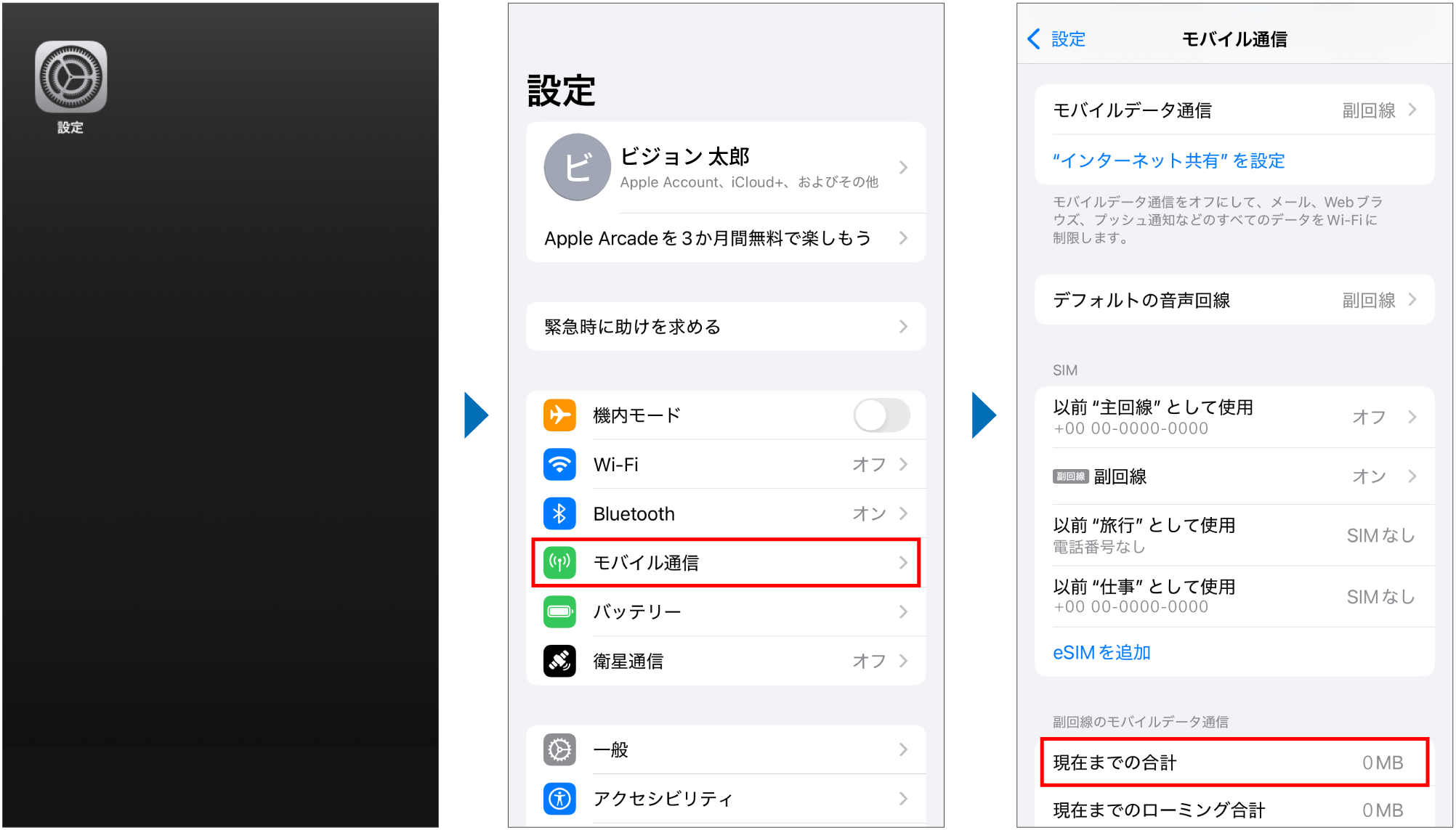 設定から進んで【モバイル通信】をタップします。→【モバイルデータ通信】がオンになっている場合、【現在までの合計】の横にデータ使用量が表示されます。